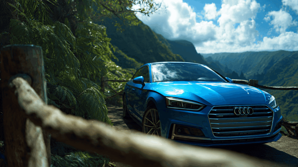 a cinematic semi-overhead photo of a blue Audi parked at a tropical cliff viewpoint, overlooking a lush valley. A blurred wooden or rope railing appears in the foreground, close to the lens, creating cinematic depth. Bright blue sky with scattered clouds, sunlight reflecting off the car’s glossy surface. Vibrant color palette with greens, blues, and rich contrast. Wide-angle perspective, ultra-sharp detail, photorealistic scene