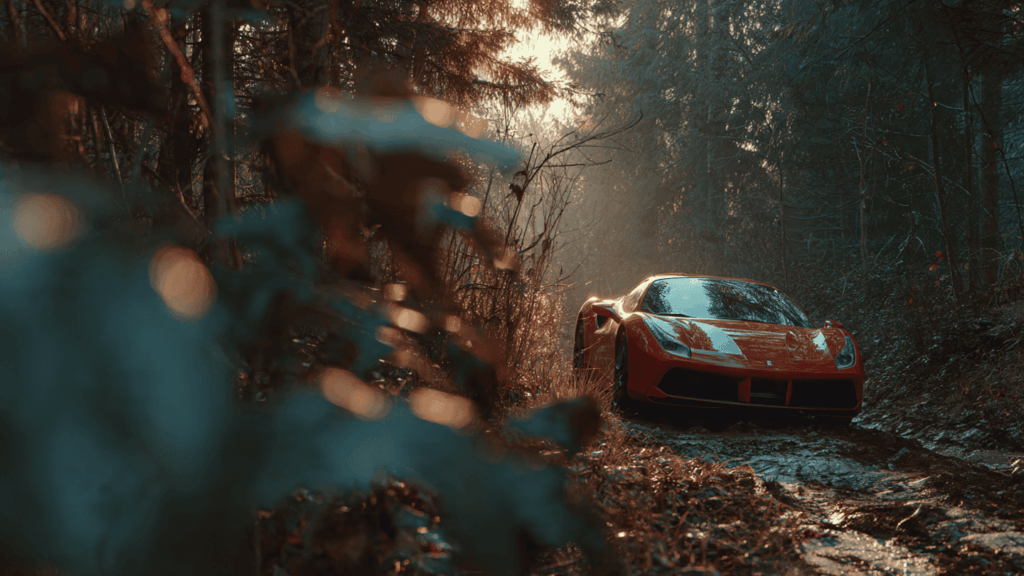 a cinematic shot of a red Ferrari parked on a muddy forest trail, viewed from a high diagonal angle, partially obscured by wet leaves and branches in the foreground (bokeh), creating a strong depth of field. Soft rays of sunlight filter through the dense trees, illuminating the sleek contours of the car. Moody, atmospheric lighting, golden hour tones. Ultra-detailed textures, cinematic composition, realistic reflections on the glossy red surface.