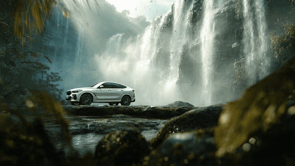 a cinematic semi-aerial shot of a white BMW X6 parked on a wet rock plateau in front of a massive tropical waterfall. The foreground includes mossy rocks and blurred water droplets near the lens, enhancing depth. Mist from the waterfall fills the background, catching beams of light. Vibrant green tones dominate the vegetation, contrasted by the glossy white car. Rich dynamic lighting, cinematic lens effects, high detail, photorealistic composition